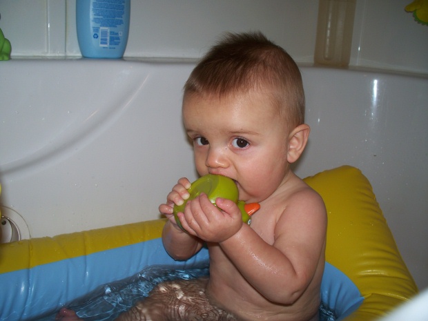 Jacob woke up again to the alarm this morning but Adam slept through it. After feeding Eli his breakfast this morning we watched a Psalty the songbook video. I tucked Eli in for a nap around 9:30 and he slept until 12:30. I did some exercises on the Wii. Then Adam picked some balance games for me to do. We got out the moon sand to play with. Nana came over around 11:30 and we cut up apples. We worked on that for a couple hours. Eli is eating carrots pureed from our garden and he really likes them. He also likes the pureed apples. Nana headed home just before 2:00. Adam rode his bike down to the end of the road where we waited for Jacob’s bus. Nik, his sister, and Mom also walked today so Jacob was happy to get to walk with them part of the way. The boys did some drawing and then painting at the counter. Eli took a short afternoon nap. Jacob got out the legos to play with. When Jared got home from work he did some exercises on the Wii. Eli cuddled on my lap. Adam also cuddled with us some. After dinner we went outside. We took a walk down our road and the boys rode their bikes. It was pj time when we got home.