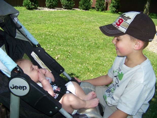 Adam and Eli were up around 8:30 and Jacob slept until 9am. After breakfast the boys and I played with legos. Eli was content to be on his belly for a short time. He started to fuss so I cuddled with him in the chair and he was full of smiles. He loves for me to play pat-a-cake with him. At 10:30 I tucked him in for a nap and he slept for 3 hrs. Jacob played webkinz on the computer. Then I helped Adam play his webkinz. After lunch the boys sat at the counter to play with flour. Jacob helped me vacuum the floor (and counter) when they were done. Jacob, Adam, Eli and I played hide and seek. Jacob and Adam are good at hiding (always together) and being really quiet. Eli and I hide behind the hanging robe in our closet. The boys had a hard time finding us there, but they kept searching and found us. Jacob and Adam put blankets, toys, and stuffed animals in the hallway and said it was their boat. We watched a Baby Einstein video. Eli took another 3 hr nap this afternoon/evening. Jacob and Adam rested on the couches while looking at books. Then they sat at the counter to draw. Jared got home around 5pm. We ate dinner a little early this evening. Daddy took Jacob and Nik (neighbor boy) to vacation bible school at our church. Adam helped me pull weeds from the flowers. Then Jared, Eli, and I relaxed on the glider. Adam had fun playing with the pool water. Jared left shortly after 8:00 to pick up the boys. Adam picked out lots of books for me to read to him and Eli. I tucked Adam in bed at 8:45 and he was asleep very quickly. Jacob was very excited to tell us about VBS and is looking forward to going back tomorrow.